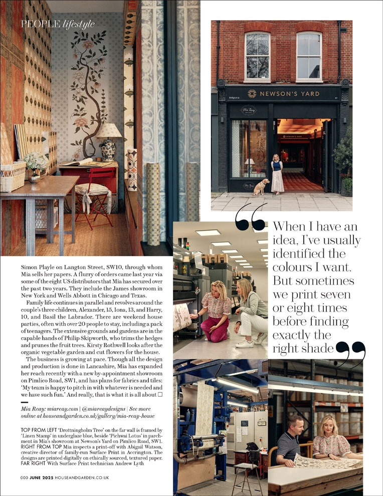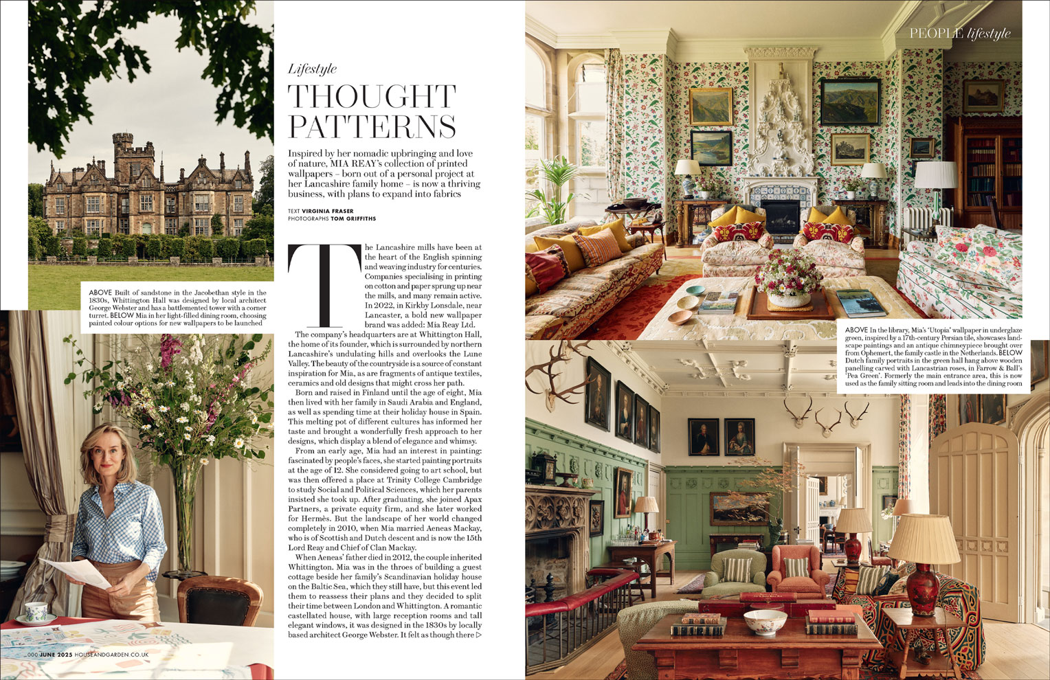 Inspired by her nomadic upbringing and love of nature, MIA REAY’s collection of printed wallpapers – born out of a personal project at her Lancashire family home – is now a thriving business, with plans to expand into fabrics. The Lancashire mills have been at the heart of the English spinning and weaving industry for centuries. Companies specialising in printing on cotton and paper sprung up near the mills, and many remain active. In 2022, in Kirkby Lonsdale, near Lancaster, a bold new wallpaper brand was added: Mia Reay Ltd. The company’s headquarters are at Whittington Hall, the home of its founder, which is surrounded by northern Lancashire’s undulating hills and overlooks the Lune Valley. The beauty of the countryside is a source of constant inspiration for Mia, as are fragments of antique textiles, ceramics and old designs that might cross her path.