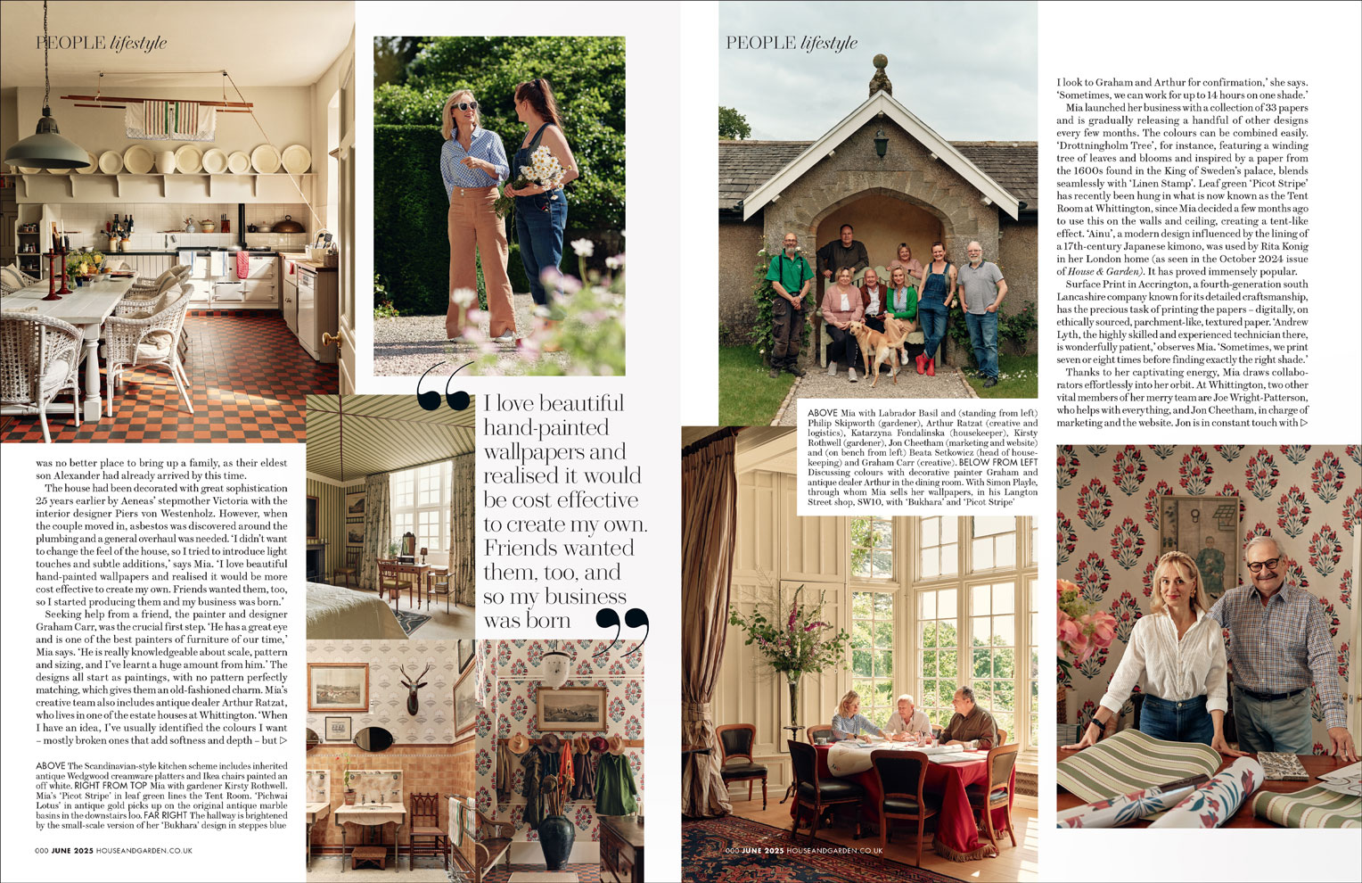 Seeking help from a friend, the painter and designer Graham Carr, was the crucial first step. “He has a great eye and is one of the best painters of furniture of our time,” Mia says. “He is really knowledgeable about scale, pattern and sizing, and I’ve learnt a huge amount from him.” The designs all start as paintings, with no pattern perfectly matching, which gives them an old-fashioned charm. Mia’s creative team also includes antique dealer Arthur Ratzat, who lives in one of the estate houses at Whittington. “When I have an idea, I’ve usually identified the colours I want – mostly broken ones that add softness and depth – but I look to Graham and Arthur for confirmation,” she says. “Sometimes, we can work for up to 14 hours on one shade.” Mia launched her business with a collection of 33 papers and is gradually releasing a handful of other designs every few months. The colours can be combined easily. ‘Drottningholm Tree’, for instance, featuring a winding tree of leaves and blooms and inspired by a paper from the 1600s found in the King of Sweden’s palace, blends seamlessly with ‘Linen Stamp’. Leaf green ‘Picot Stripe’ has recently been hung in what is now known as the Tent Room at Whittington, since Mia decided a few months ago to use this on the walls and ceiling, creating a tent-like effect. ‘Ainu’, a modern design influenced by the lining of a 17th-century Japanese kimono, was used by Rita Konig in her London home (as seen in the October 2024 issue of House & Garden). It has proved immensely popular.
